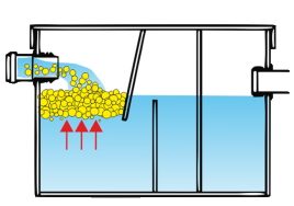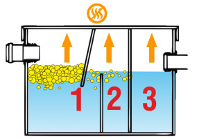 Коалесцентный фильтр образуется на поверхности воды. Сток, проходя через него, разделяется, оставляя жир на фильтре. Вода, очищенная от жира проходит дальше.